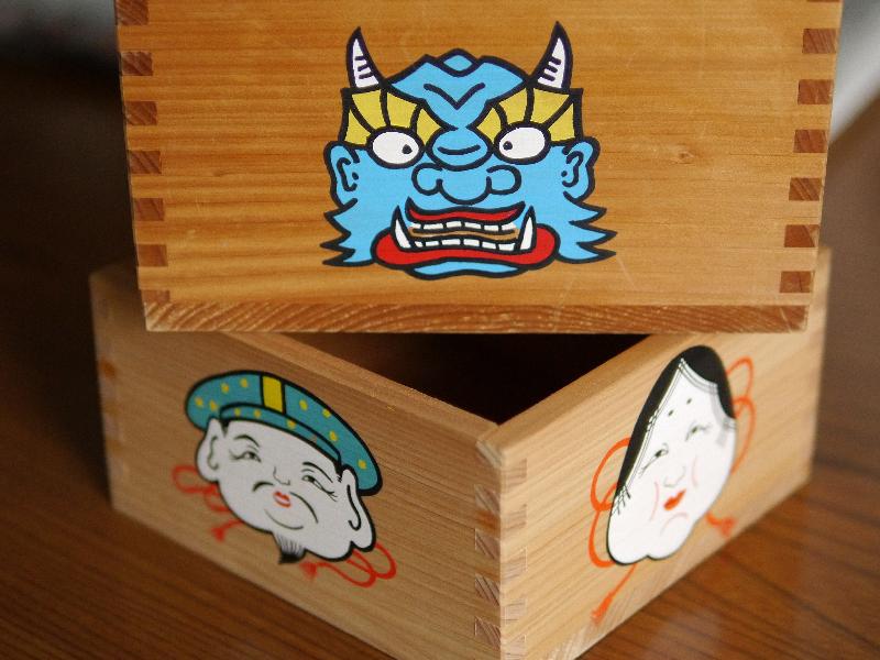 神社の豆まきに使った大きな枡の周りと中に鬼や
