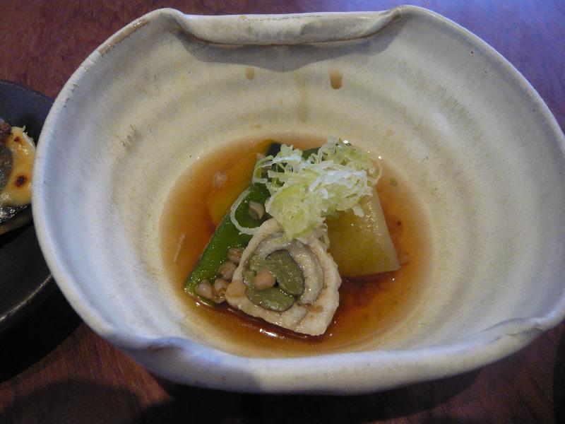 鱧で野菜を巻き煮物に