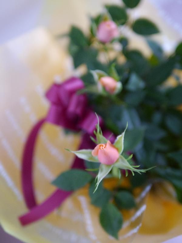 国際会館のフラワーショップで淡い花のアレンジを買って